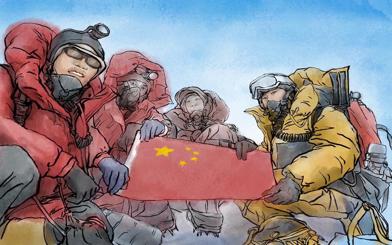 师生们始终扎根中国、胸怀世界,为国家尊严而登山,为服务科考而登山的豪情,深深地影响陈华文。他觉得作为地大人,应该把攀登故事和攀登精神,用“文字+绘画”的方式呈现出来。5月初,为了创作《攀登者》绘本,他和学校登山科考专家教授座谈、听取创作建议。在参考大量登山图片的基础上,拟定创作方向和思路,带领刘雅文、唐钰君两名学生,进行创作。