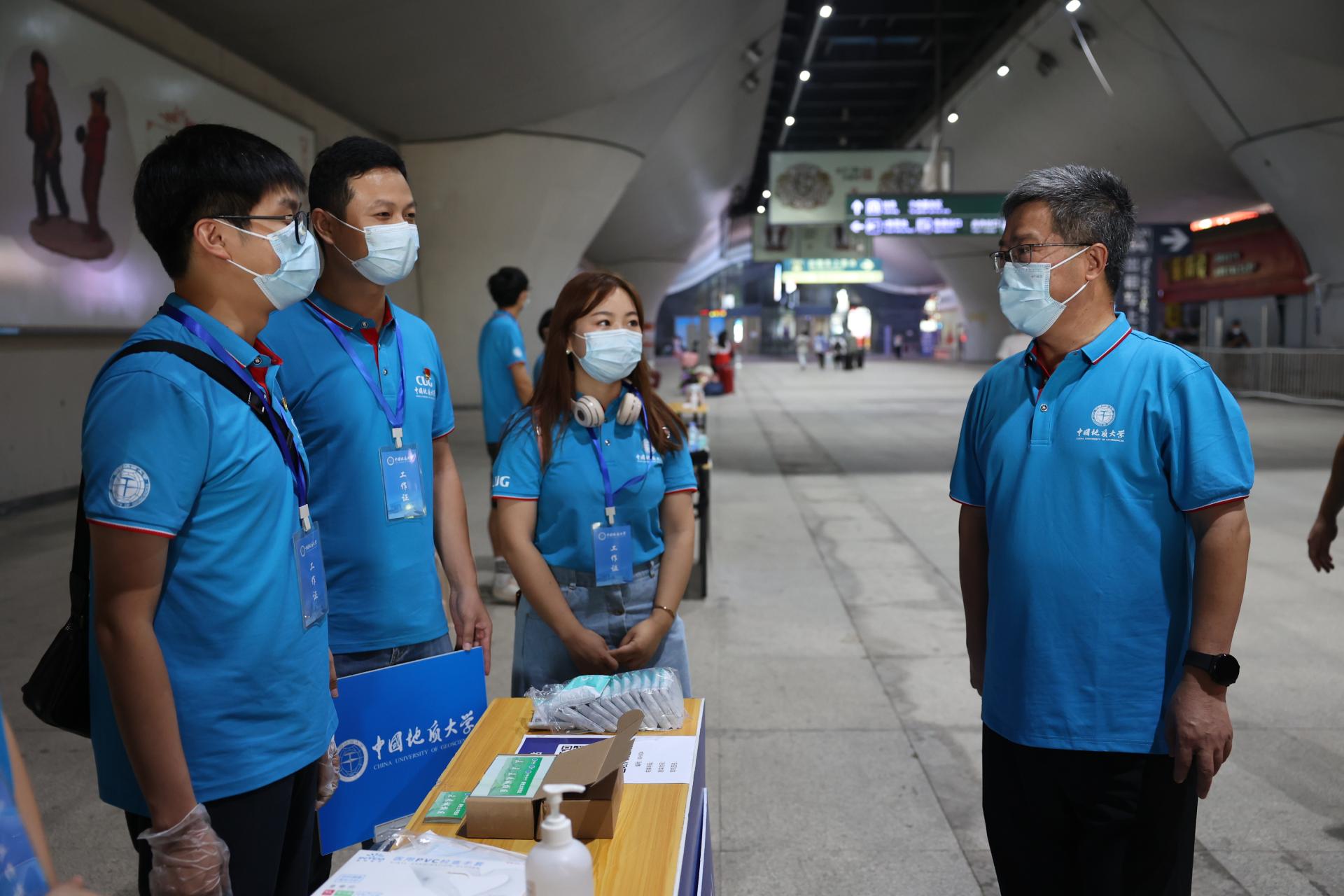 当日清晨,党员教师志愿者们身穿“地大蓝”文化衫,逐一清点接站物资后出发前往火车站。到达车站后,他们迎接一波又一波的新生,高效有序地完成消杀、核验、扫码和引导等各项工作,党员教师志愿者们热情周到的服务、吃苦耐劳的作风,给新生和家长留下了深刻的印象。