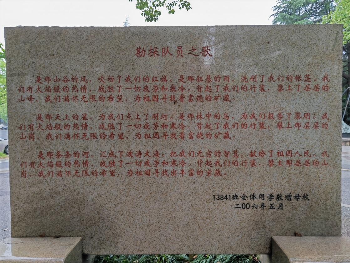 矗立在院士长廊南口东端、背靠教一楼的“开发矿业”碑是一块宽2.6米、高1.8米、厚0.2米的黄锈色花岗岩长方形石碑,其造型简约规整、方正挺拔、厚重朴实,安放在两块同质花岗岩基座上。石碑正面镌刻着毛泽东同志题写的四个大字——开发矿业,背面则刻有校歌《勘探队员之歌》歌词。