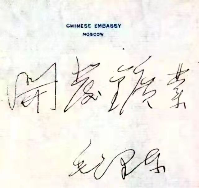 毛泽东欣然应允,给每个人都题了词。轮到任湘时,因为手边没有带本子,他便向大使馆同志要了两页白色公文笺。