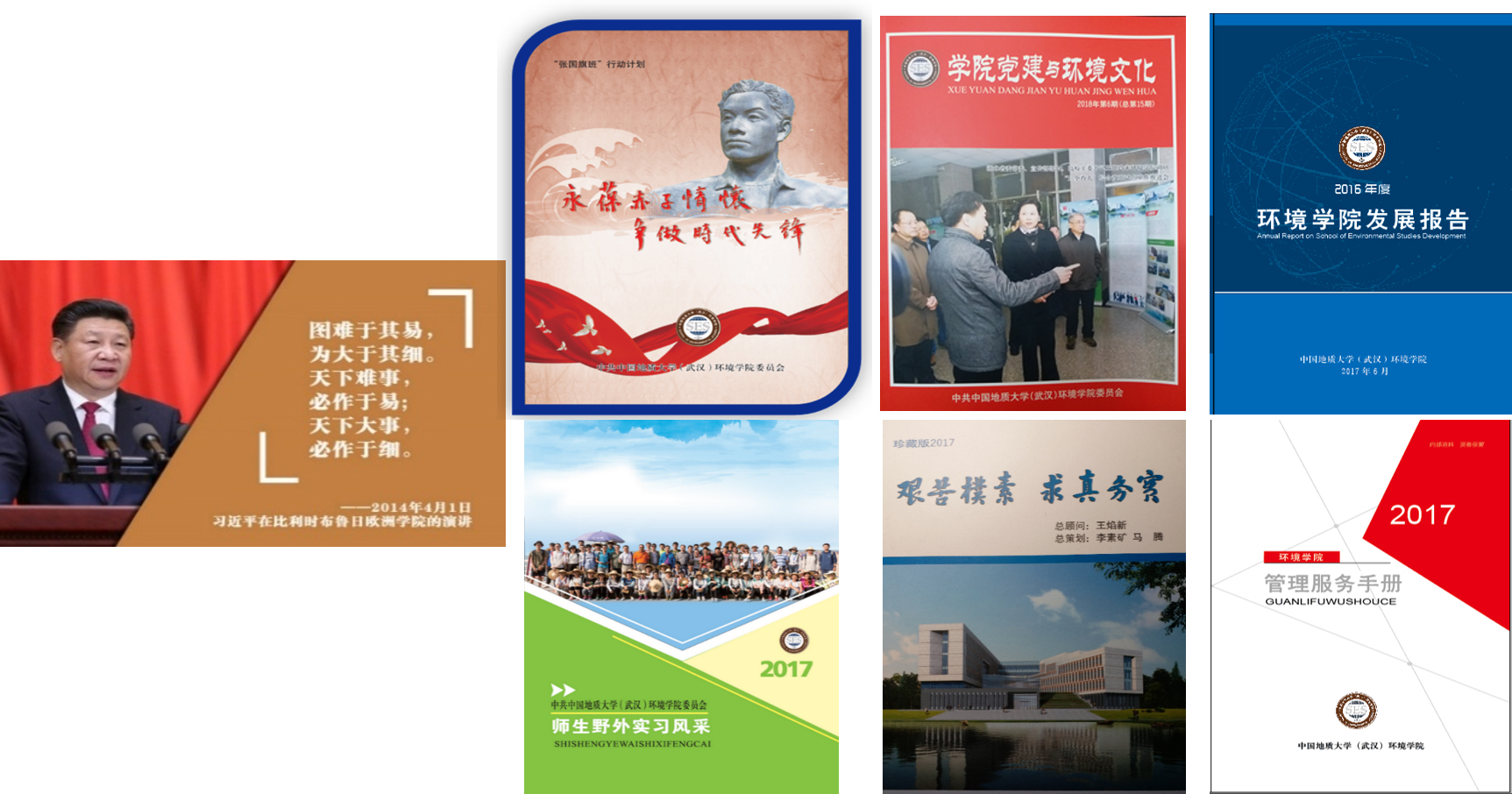 五年来,“张国旗班”行动计划始终在积极营造浓厚的文化氛围,打造特色思政文化品牌,滋养环境文化根系。学院倾力打造 “1+6”思政育人载体,如:《我最喜爱的习近平总书记的一句话》系列明信片,将新思想、新理念播撒在学生的心中;每年编印《师生野外实习风采展》,记录环境学子在山水林田湖草间躬行的身影;院刊《学院党建与环境文化》至今已编印34期,记录学院党建工作动态;《环境学院年度发展报告》则集中梳理历年学院发展的高光时刻;《师生管理服务手册》做到精细化服务师生 ;创作的院歌《艰苦朴素 求真务实》人人传唱,唱出环境人的豪迈;《“张国旗班”行动计划画册》浓缩着环境学子的成长历程。