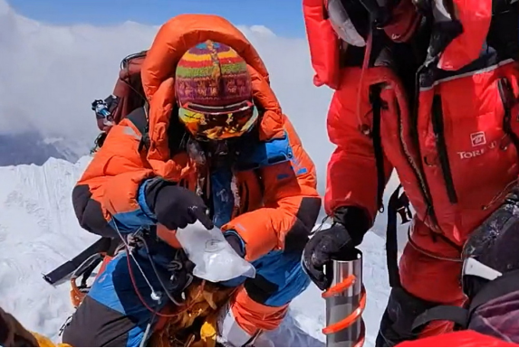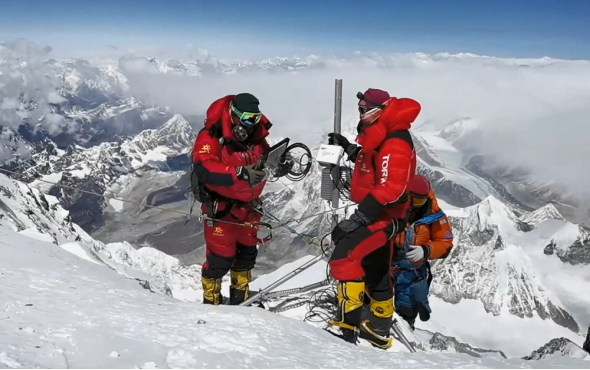5月4日中午,我国珠峰科考队员在珠穆朗玛峰峰顶进行采样。