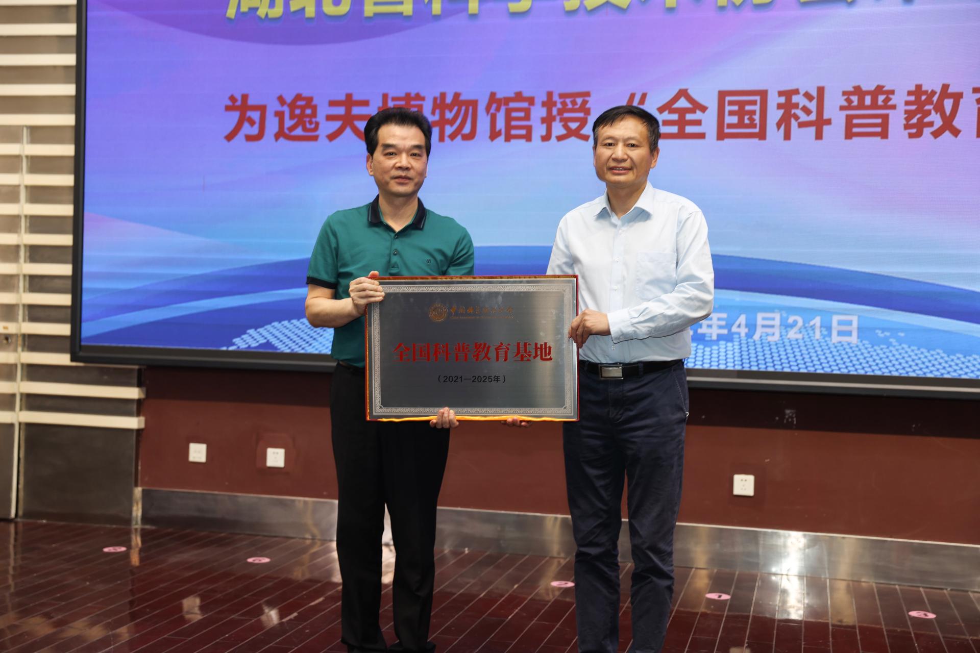 朱志斌为“全国科普教育基地”授牌,米兰逸夫博物馆馆长刘先国接牌。