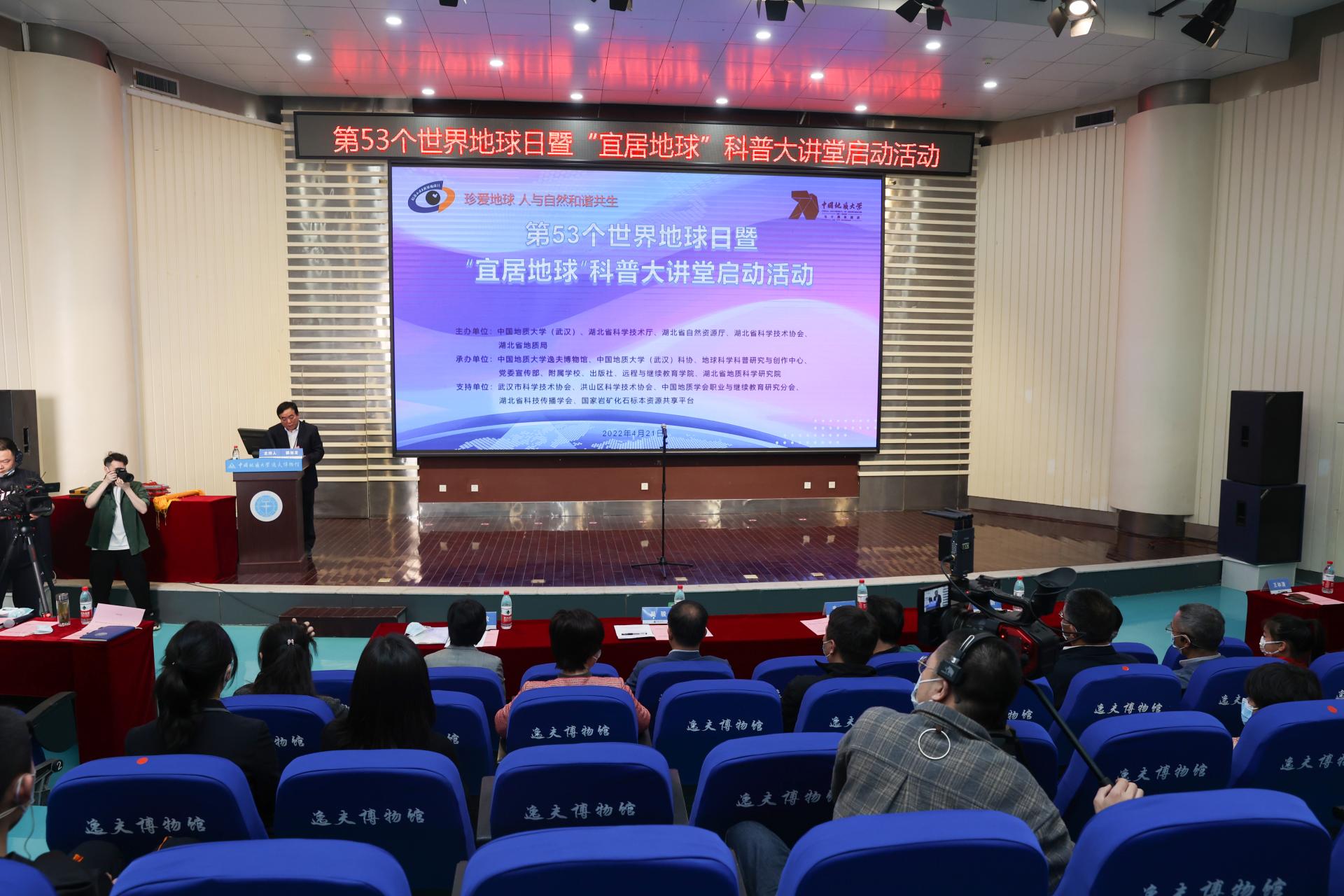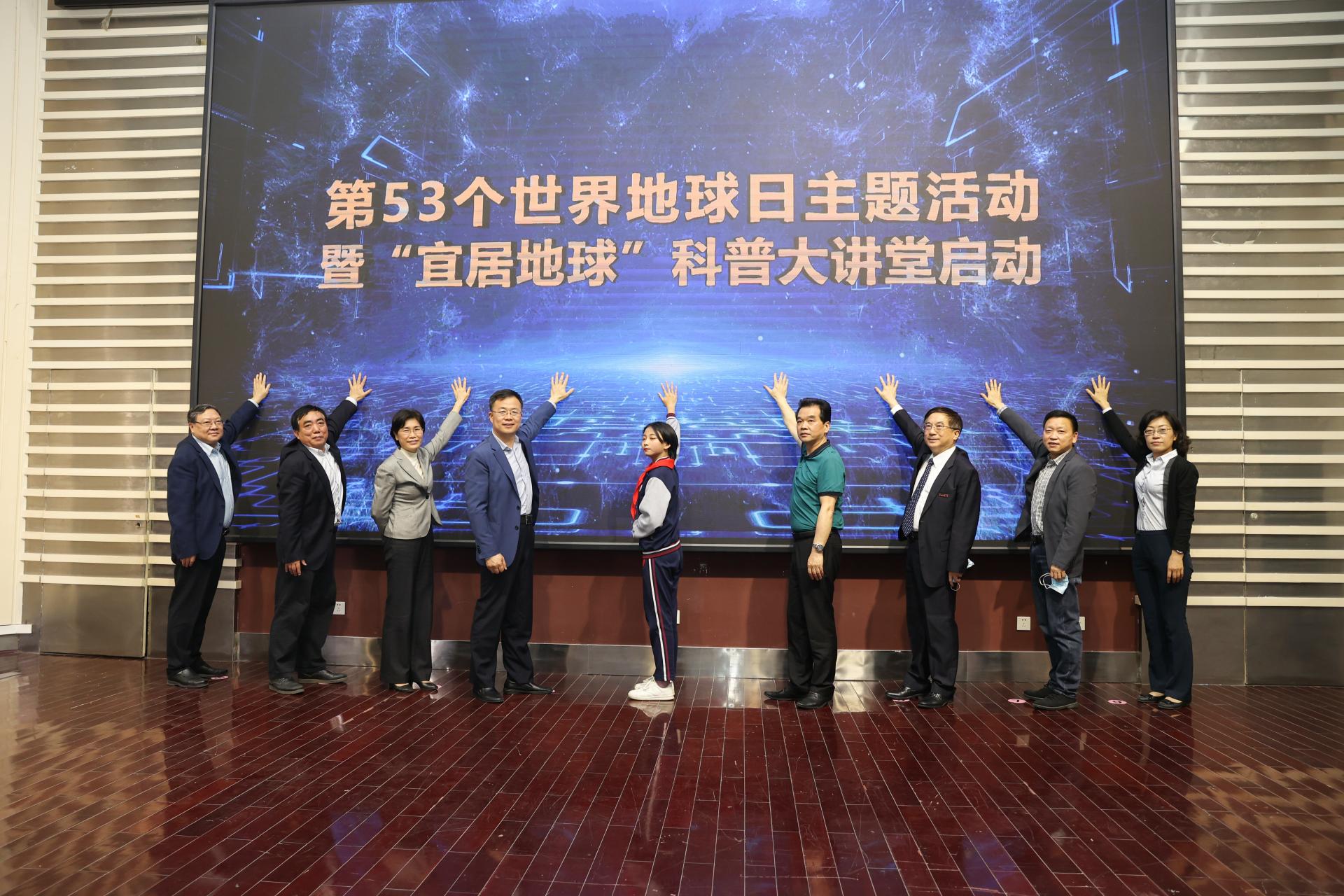 黄晓玫、王焰新、吴骏及与会嘉宾和学生代表共同开启屏幕,宣布第53个世界地球日主题宣传活动周暨“宜居地球”科普大讲堂正式启动。