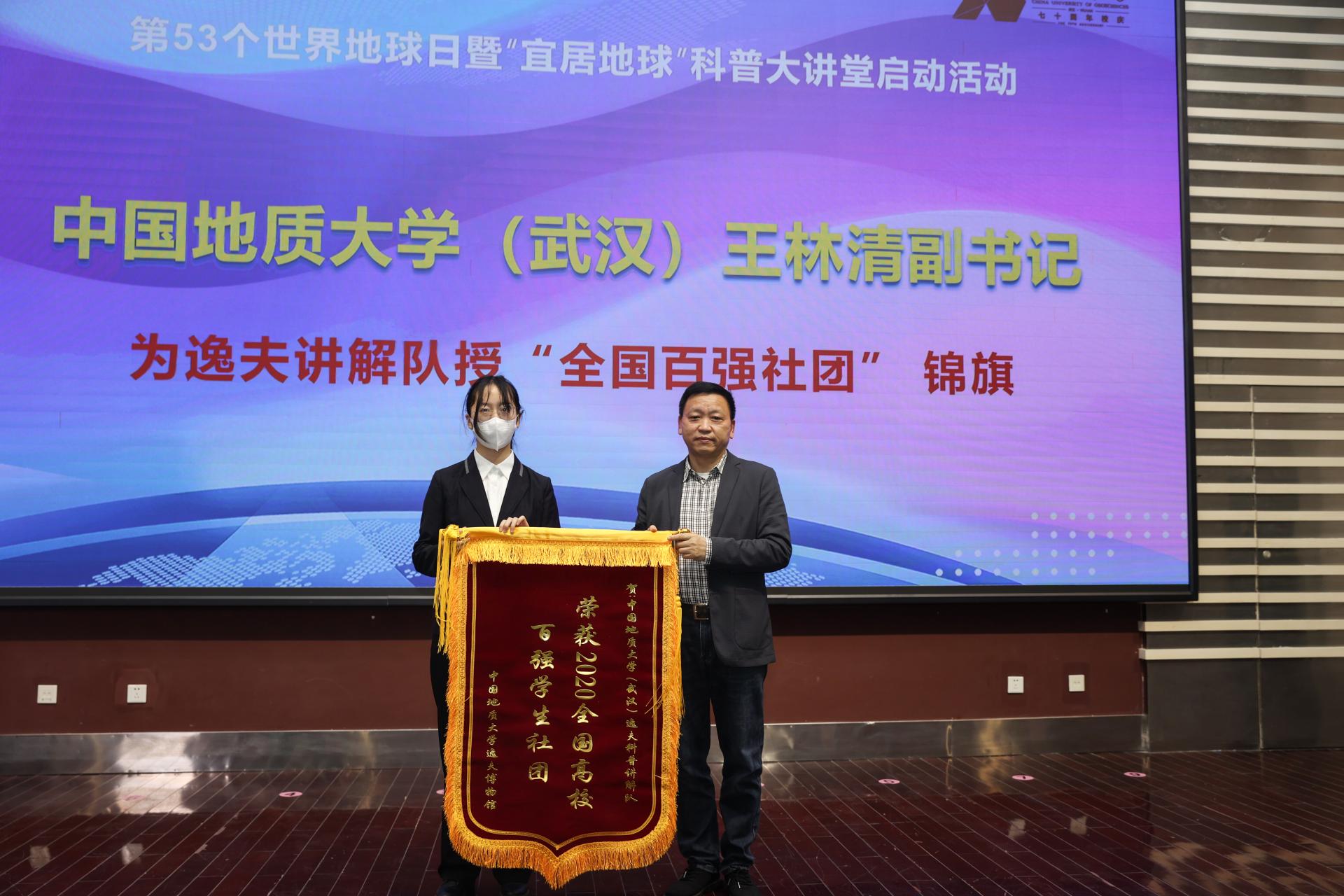 王林清为米兰milan官方网站逸夫科普讲解队授“全国高校百强学生社团”锦旗。