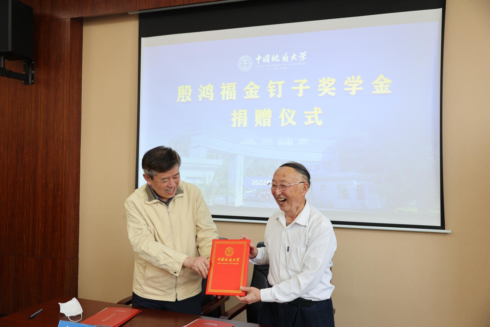 学校基金会理事长郝翔向殷鸿福院士颁发《捐赠证书》