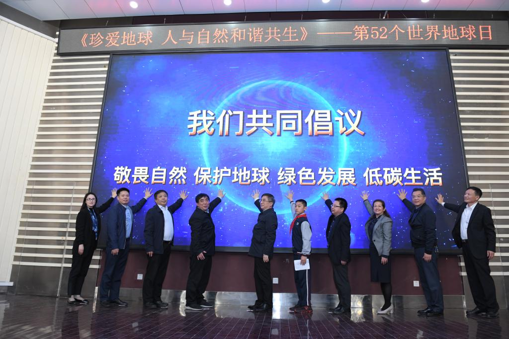 在第52个世界地球日主题宣传活动上,中科院院士、校长 王焰新,副校长赖旭龙与嘉宾、学生代表共同发起“敬畏自然 保护地球 绿色发展 低碳生活”的倡议 张玉贤 摄
