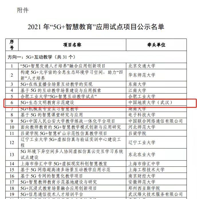地大新闻网讯(通讯员高浪 张磊)近日,工业和信息化部、教育部联合公示2021年“5G+智慧教育”应用试点项目入围名单,米兰牵头申报的“5G+生态文明教育示范建设”项目成功入选。