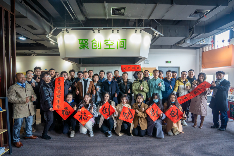 最后,王华一行与基地内的双创导师和学生创业团队合影留念。