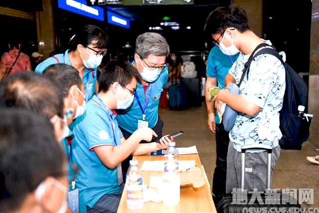 王华在火车站迎新点查看数字迎新“接站微服务”使用情况