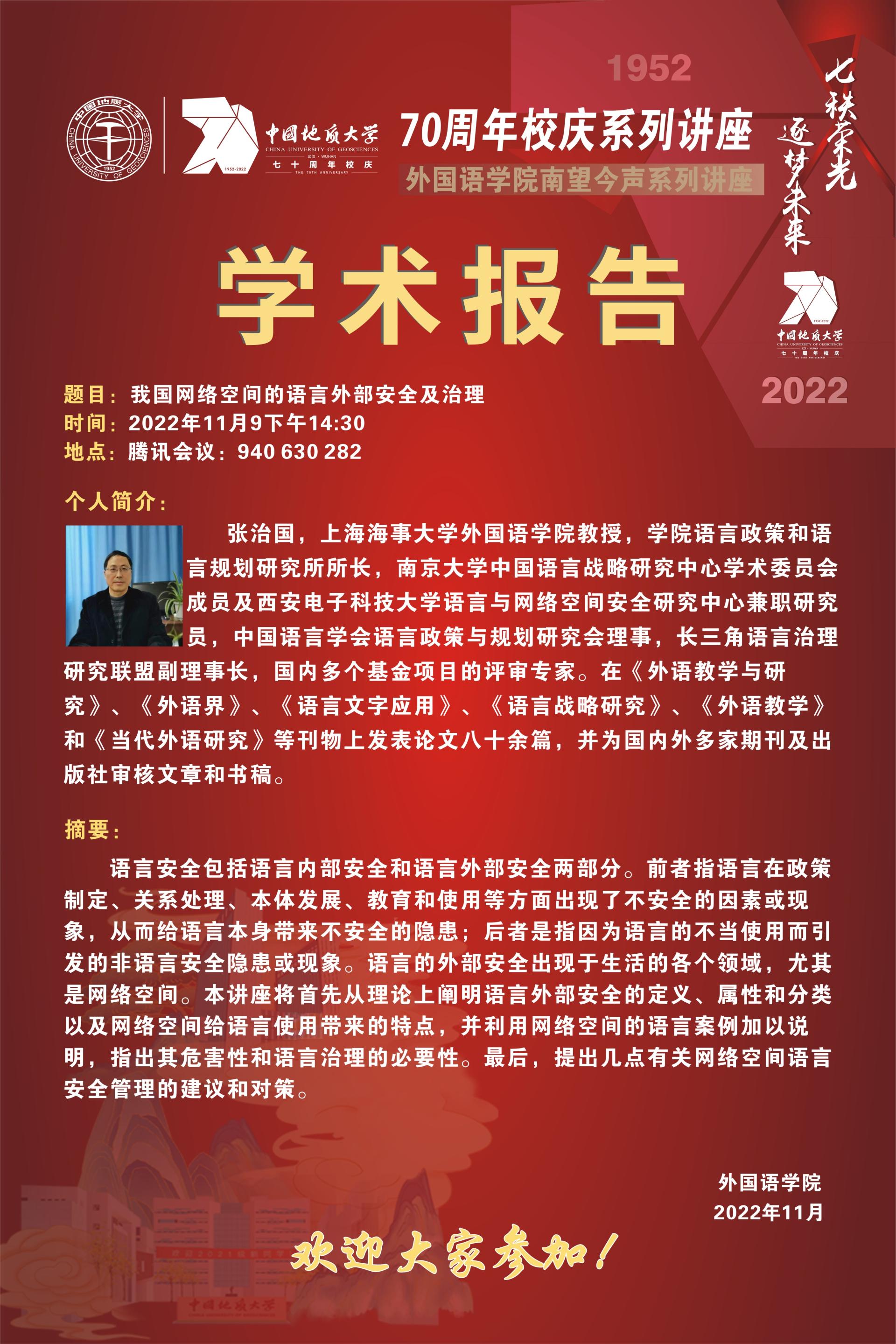【11月9日】“南望今声”外语系列讲座:上海海事大学外国语学院 张治国教授学术报告