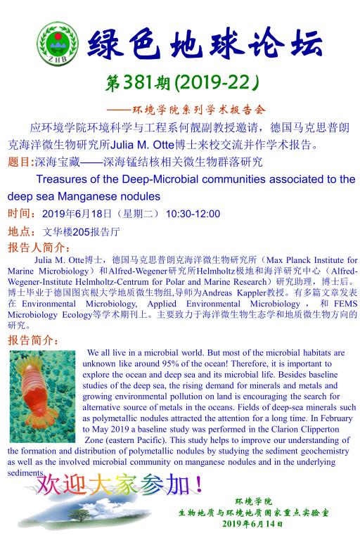 [6月18日]绿色地球论坛:德国马克思普朗克海洋微生物研究所Julia M.Otte博士学术报告