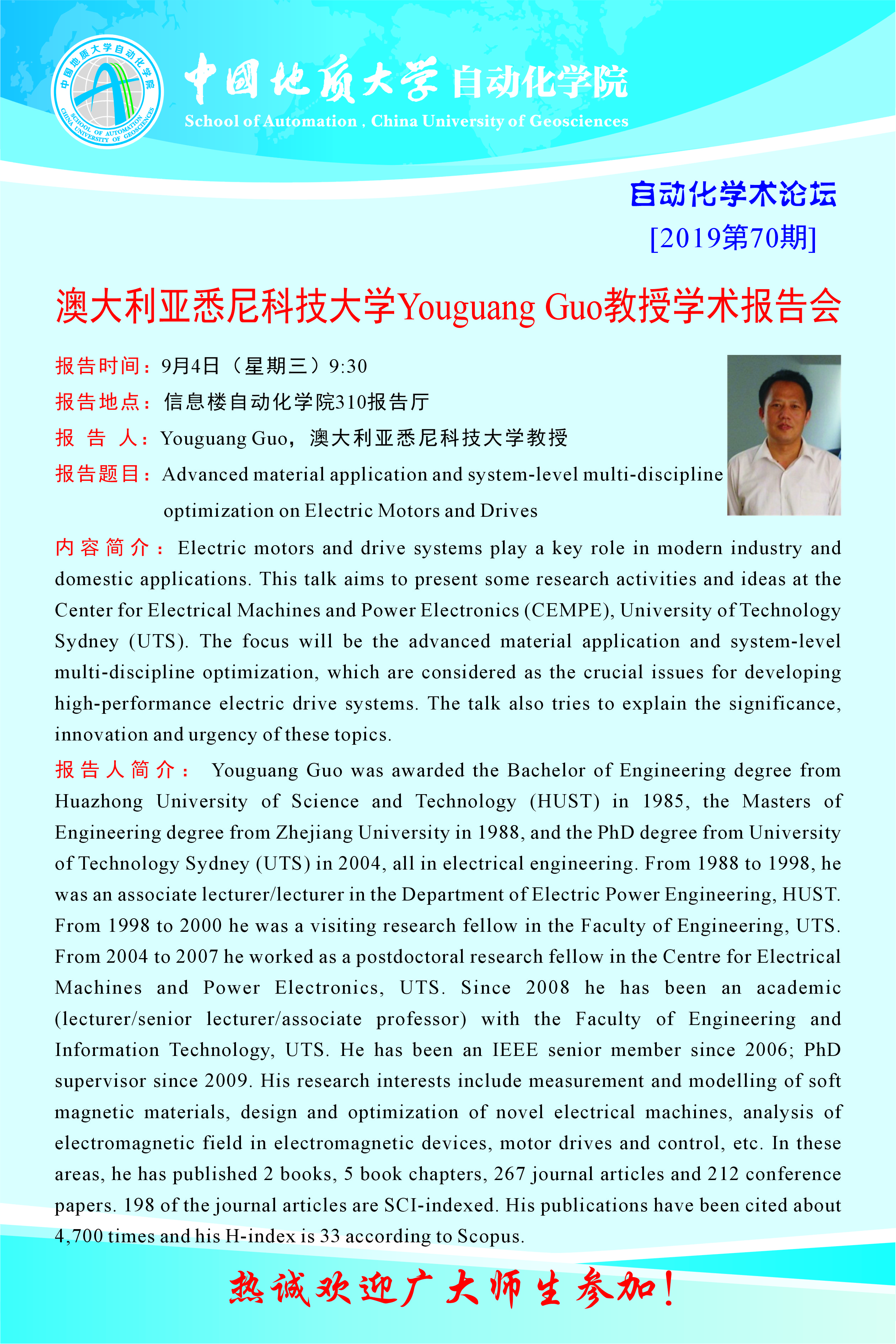 [9月4日]自动化学术论坛:澳大利亚悉尼科技大学Youguang Guo教授学术报告