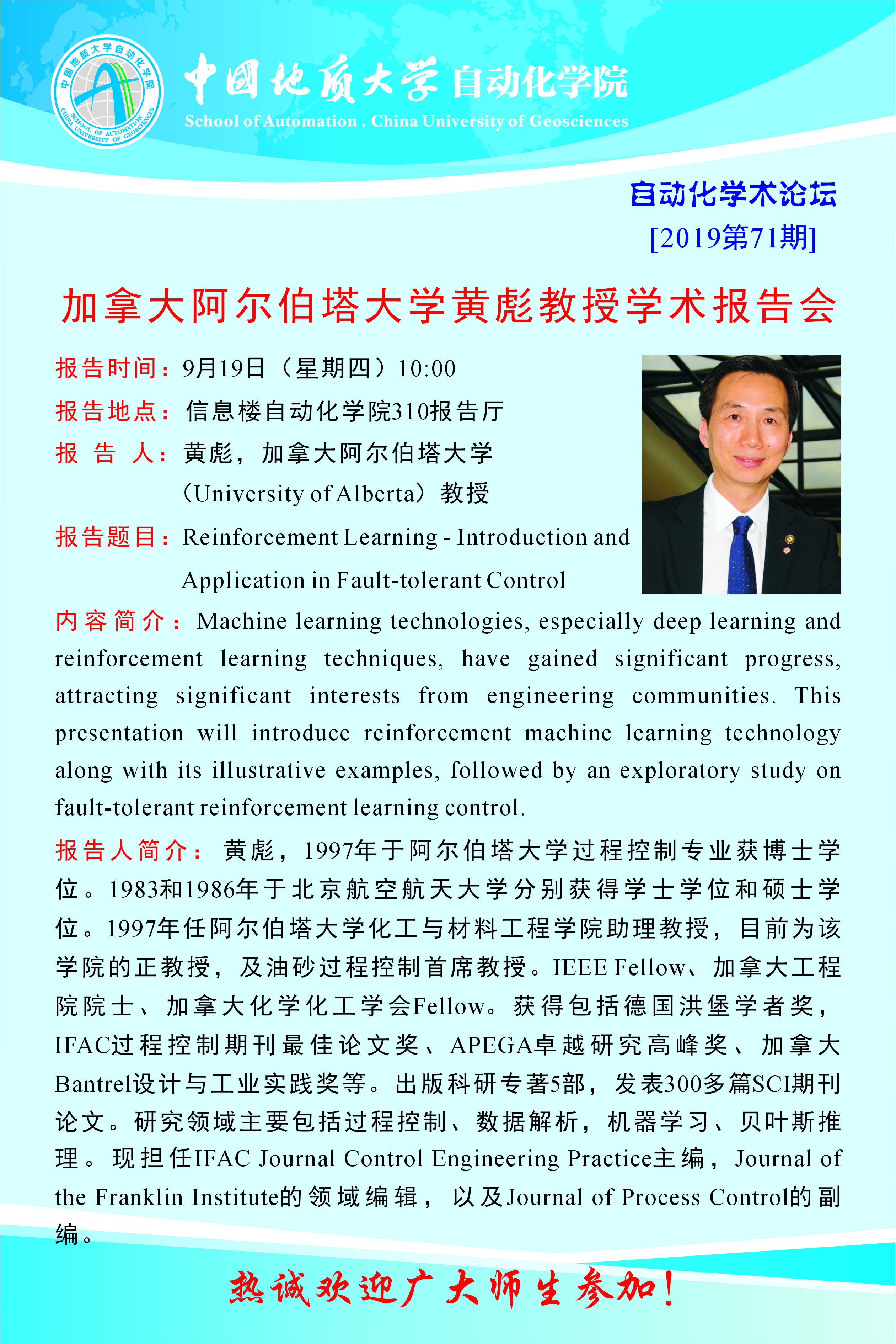[9月19日]自动化学术论坛:加拿大阿尔伯塔大学黄彪教授学术报告