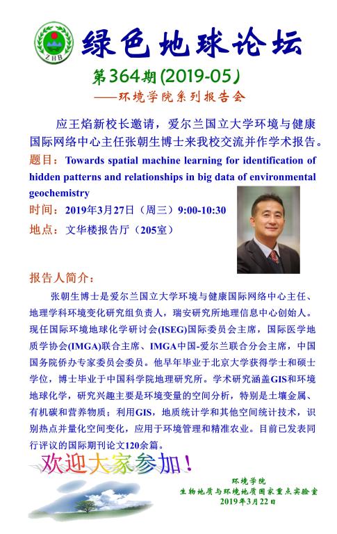 [3月27日]绿色地球论坛:爱尔兰国立大学环境与健康国际网络中心主任张朝生博士学术报告