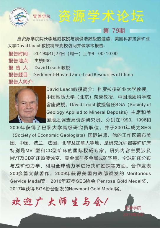 [4月22日]资源学术论坛:美国科罗拉多矿业大学David Leach教授学术报告