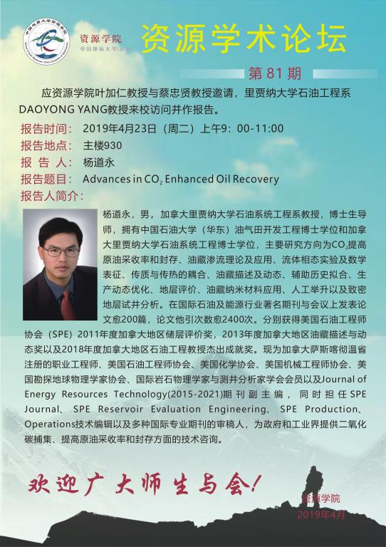 [4月23日]资源学术论坛:里贾纳大学石油工程系杨道永教授学术报告