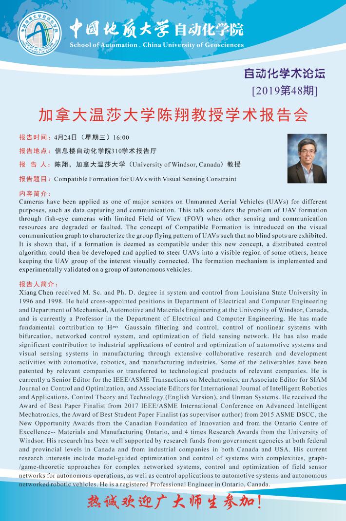 [4月24日]自动化论坛:加拿大温莎大学陈翔教授学术报告