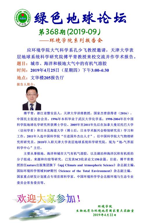 [4月25日]绿色地球论坛:天津大学表层地球系统科学研究院傅平青教授学术报告