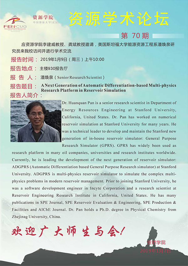 [1月9日]资源学术论坛:美国斯坦福大学能源资源工程系潘焕泉研究员学术报告